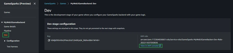Let's attach the created policy to the game backend IAM role. Open the Amazon GameSparks console, select your game and in the navigation pane, select Dev. Then under Dev stage configuration choose View in IAM console: