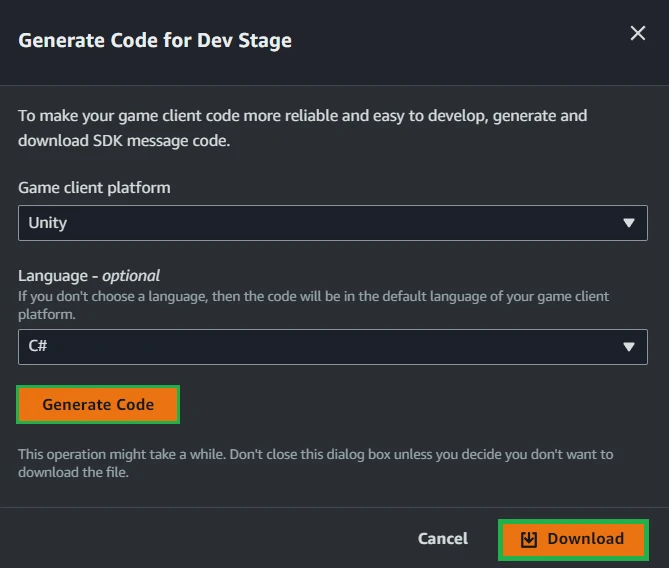 Select Unity as Game client platform and C# as Language. Then click on Generate Code, wait for some seconds and click on Download: