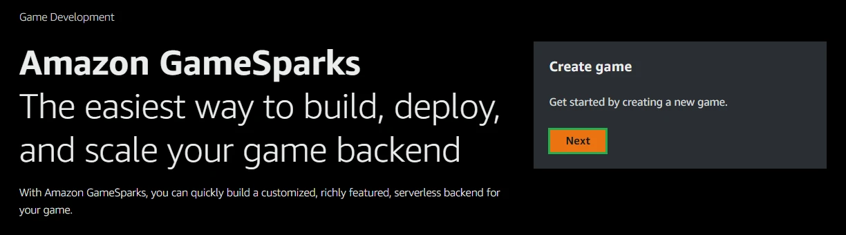 Open the Amazon GameSparks console and click on Next to create a game and get started developing your game backend: