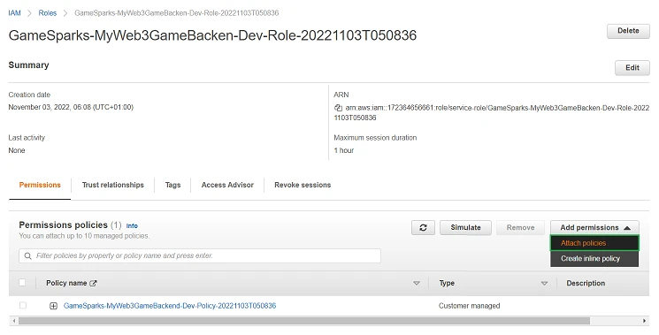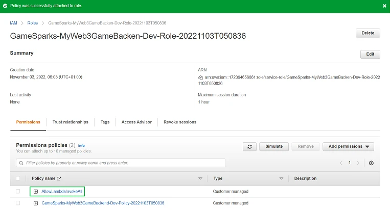 Now that we have the game backend deployed, let's give it permission to invoke Lambda functions. Remember that in this tutorial we will be calling the Lambda functions deployed in Lambda App with multiple functions, but to do so, we first need to grant premissions.