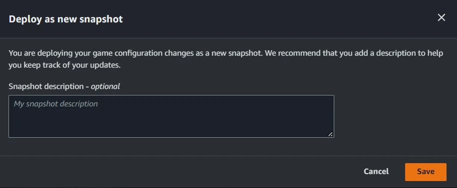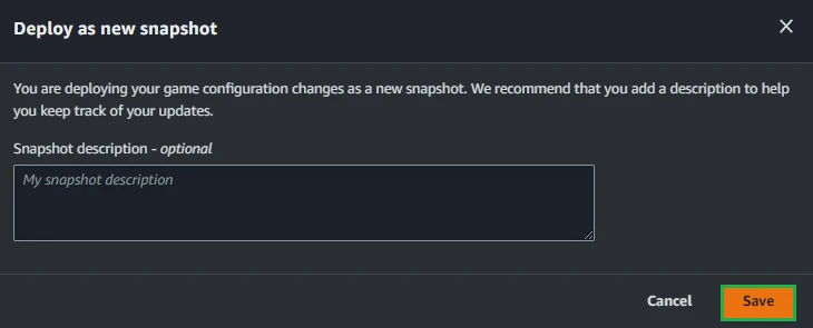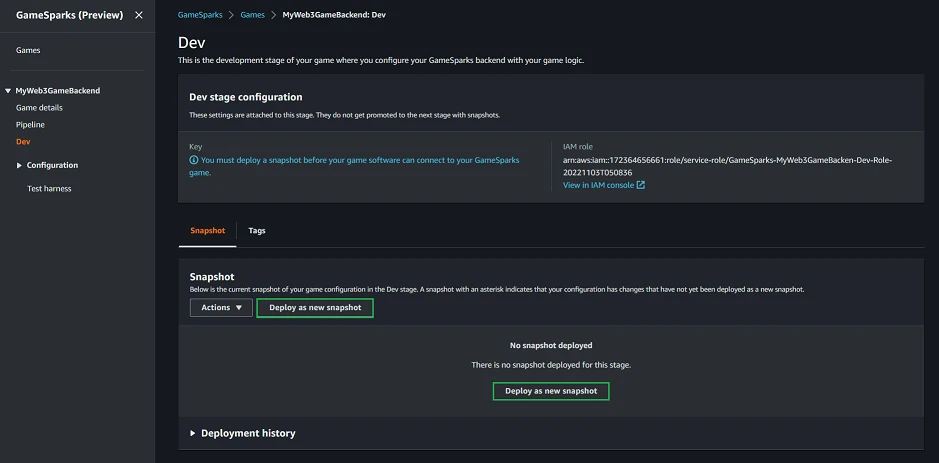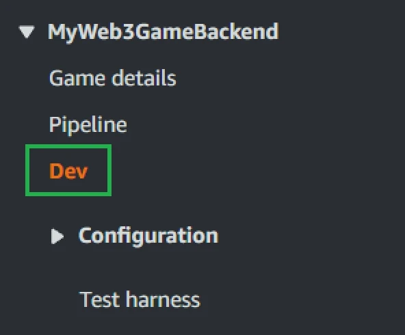 Before doing any configuration, let's deploy a fresh snapshot of the game backend. In the navigation pane, choose Dev: