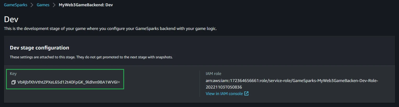 To find the key, open the Amazon GameSparks console, select your game and in the navigation pane, select Dev. Copy the Key: