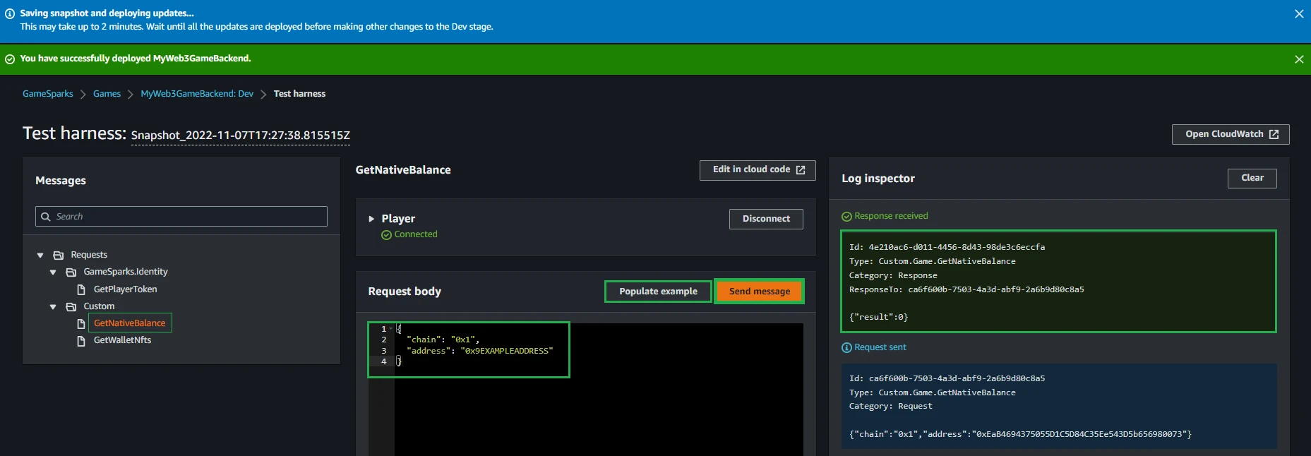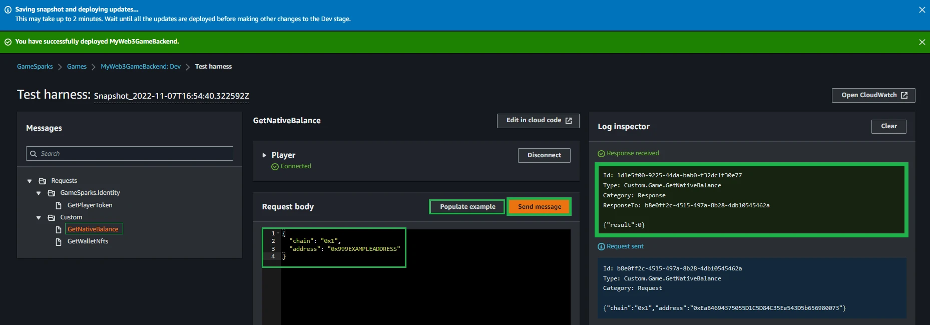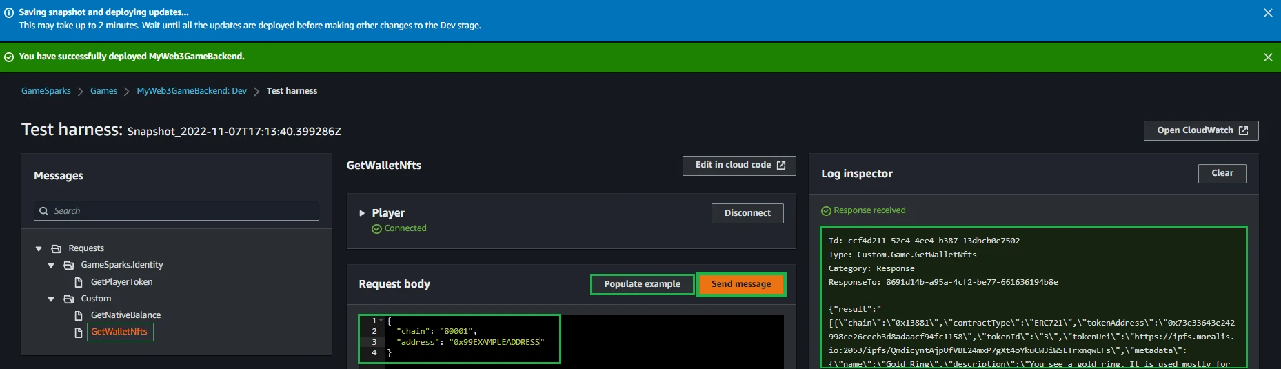 Congratulations! You can now test the GetWalletNfts request by first pressing Populate example and then Send message: