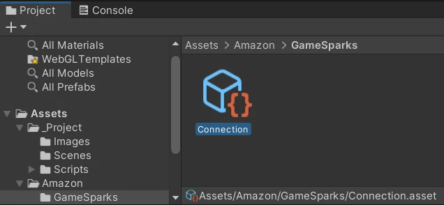 On the Project tab, go to Assets --> Amazon --> GameSparks and choose the Connection.asset: