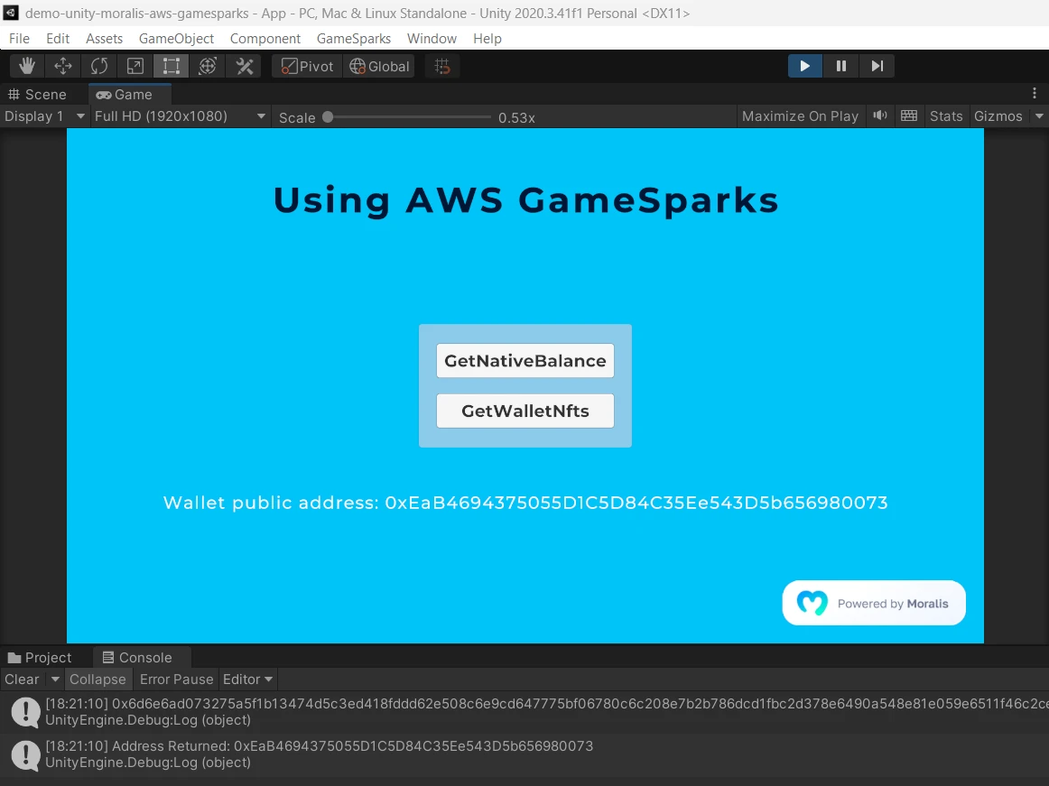 Now go back to Unity and see that you're successfully authenticated. Unity also logged your wallet public address: