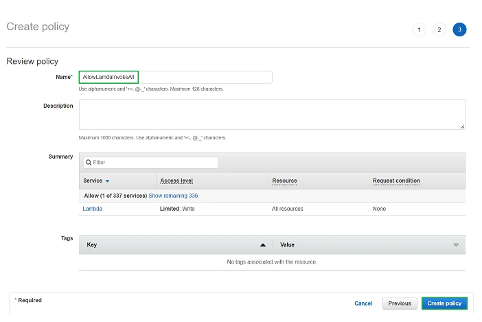 In Review, name your policy, for example AllowLambdaInvokeAll and choose CreatePolicy: