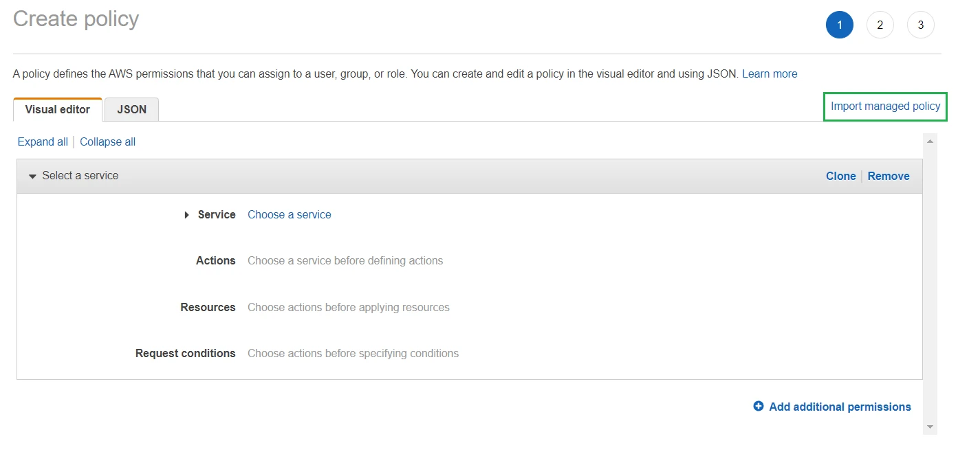 First, let's create the permission itself. Open the IAM Create policy page and choose Import managed policy: