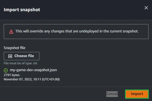Now open the Amazon GameSparks console, select your game and in the navigation pane, select Dev. Then under Snapshot choose Actions --> Import: