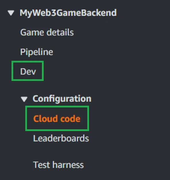 Open the Amazon GameSparks console, select your game and in the navigation pane, select Dev, expand Configuration, and then choose Cloud code: