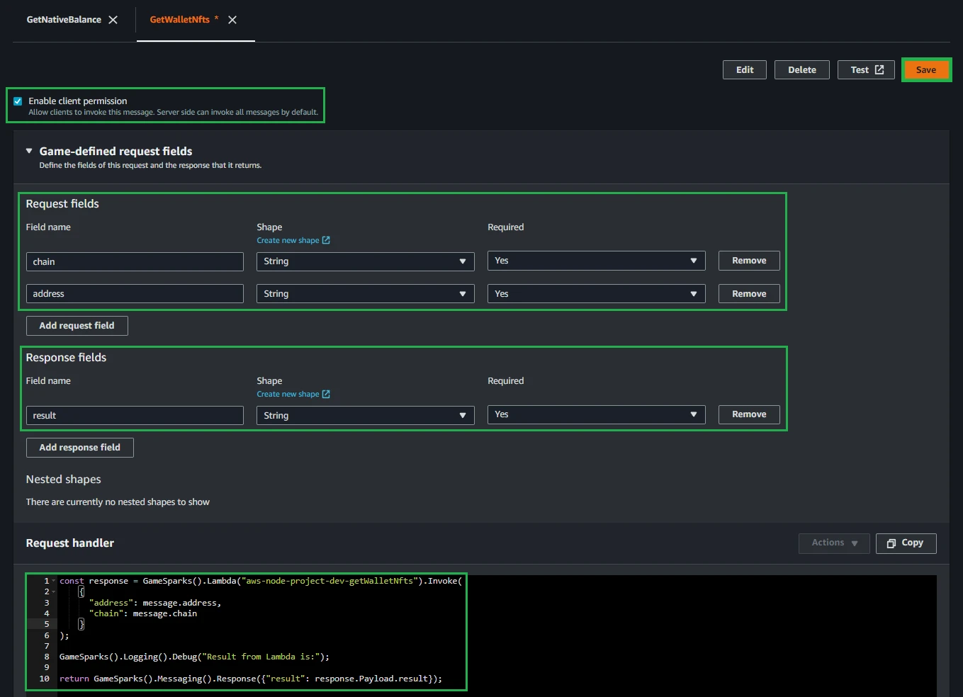 "Script" : "const response = GameSparks().Lambda(\"aws-node-project-dev-getWalletNfts\").Invoke(\r\n {\r\n \"address\": message.address,\r\n \"chain\": message.chain\r\n }\r\n);\r\n\r\nGameSparks().Logging().Debug(\"Result from Lambda is:\");\r\n\r\nreturn GameSparks().Messaging().Response({\"result\": response.Payload.result});",