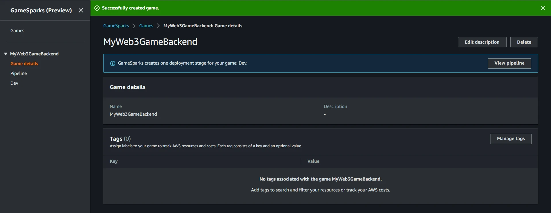 You now have a created an Amazon GameSparks backend that is ready for you to configure: