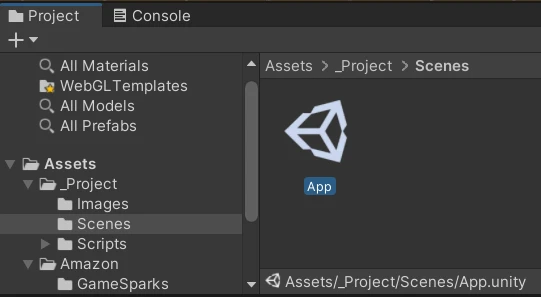On the Project tab, go to Assets --> _Project --> Scenes and open App.unity: