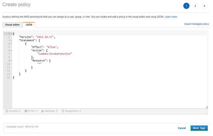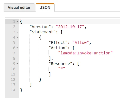 This policy allows invoking any Lambda function that we got deployed. If we click on the JSON tab we can see there's a "*" in Resource. To specify which Lambda function we want its invocation to be allowed, we could paste its ARN in Resource, but in this case we leave it as "*" as we want to allow the invocation of all our Lambda functions: