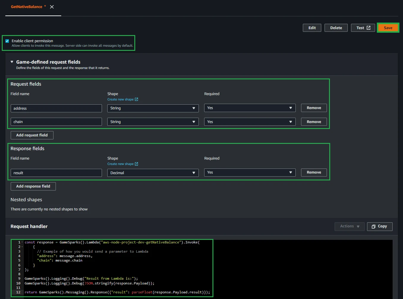"Script" : "const response = GameSparks().Lambda(\"aws-node-project-dev-getNativeBalance\").Invoke(\r\n {\r\n // Example of how you would send a parameter to Lambda\r\n \"address\": message.address,\r\n \"chain\": message.chain\r\n }\r\n);\r\n\r\nGameSparks().Logging().Debug(\"Result from Lambda is:\");\r\nGameSparks().Logging().Debug(JSON.stringify(response.Payload));\r\n\r\nreturn GameSparks().Messaging().Response({\"result\": parseFloat(response.Payload.result)});",