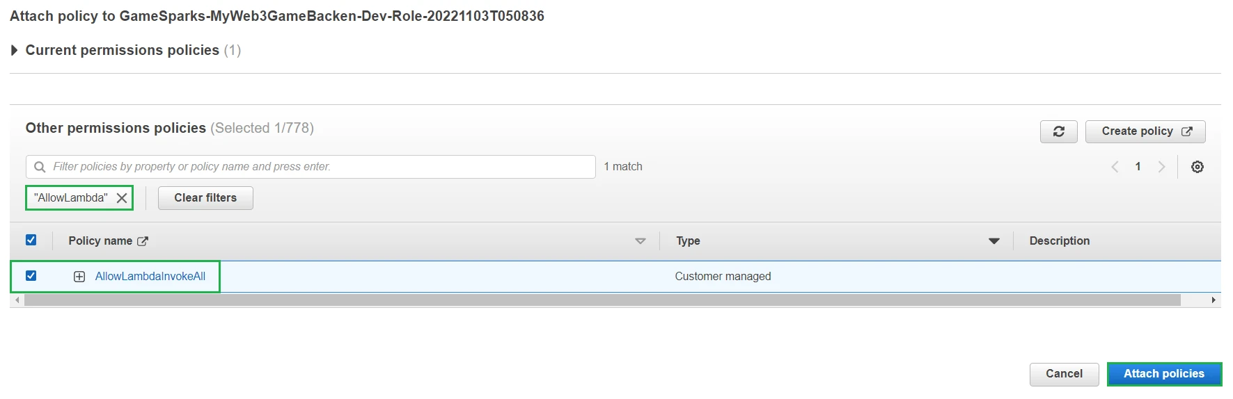 Filter for AllowLambda, select your created policy and press Attach policies: