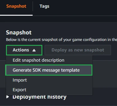 Open the Amazon GameSparks console, select your game and in the navigation pane, select Dev. Then under the Snapshot section select Actions --> Generate SDK message template: