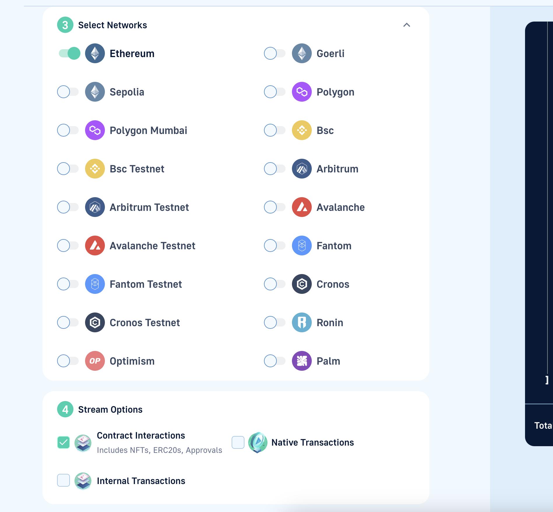 Our contract is deployed on Ethereum mainnet, so here you will select the network that your smart contract is deployed on: And also select contract interactions.