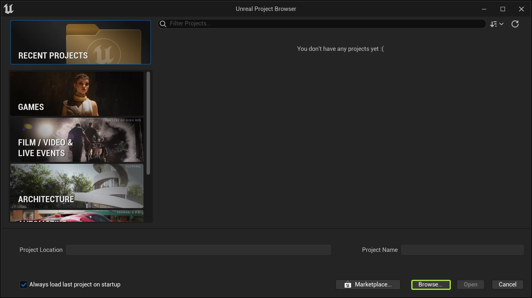 After downloading the project, launch Unreal Engine 5.1 and under RECENT PROJECTS, choose Browse: