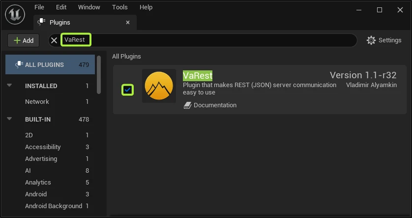Search for VaRest, enable the checkbox and close the Plugins window: