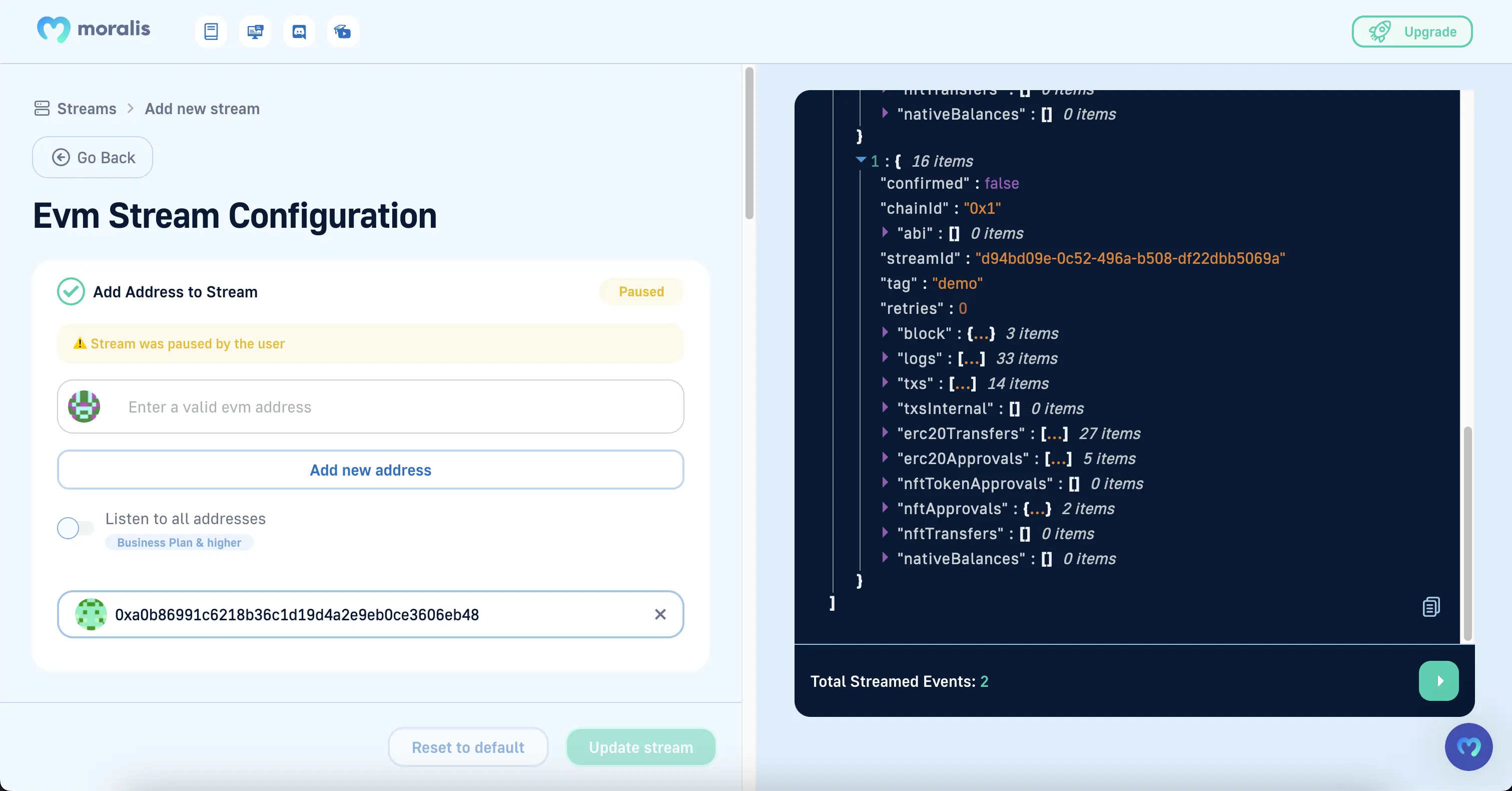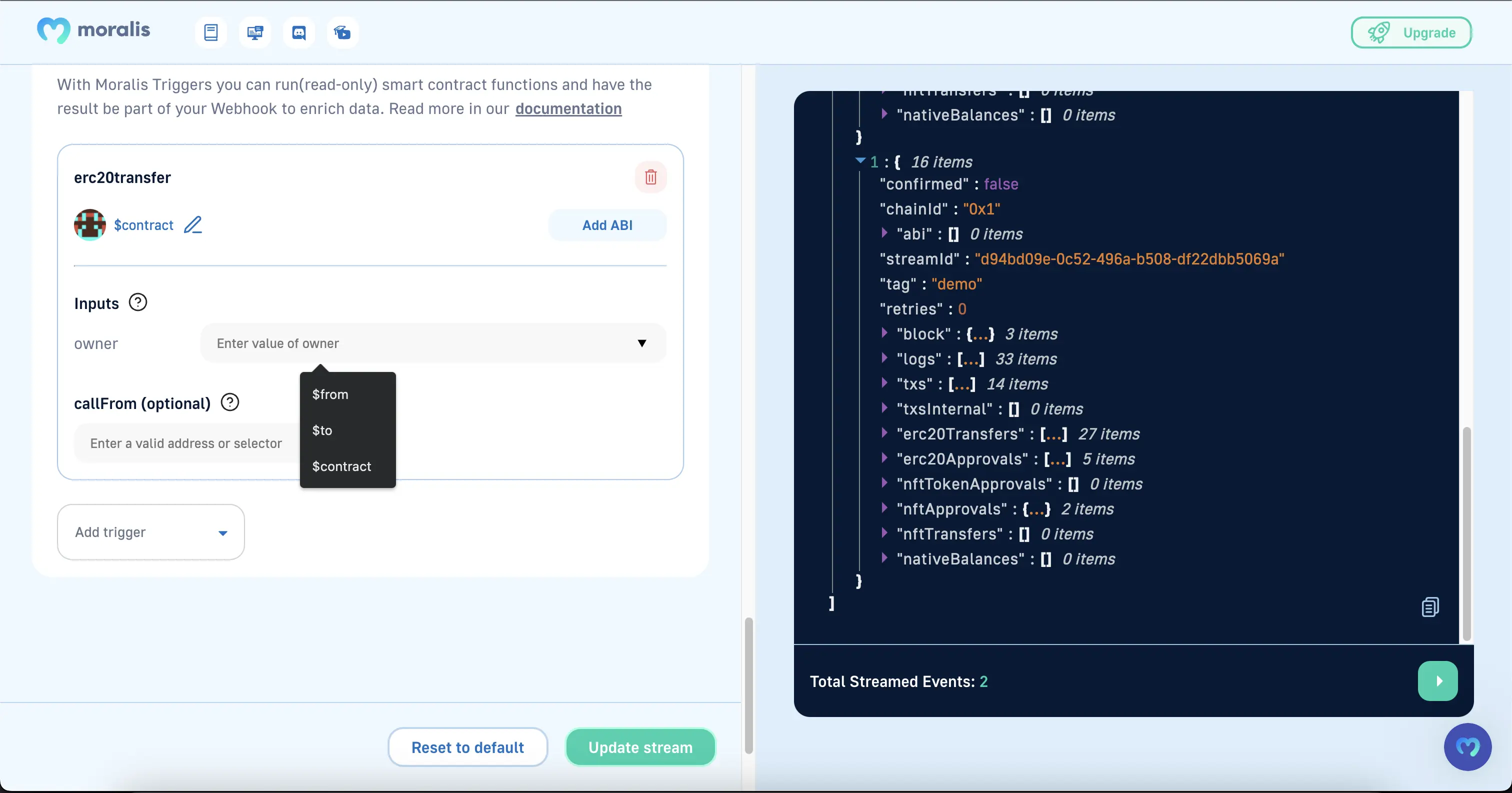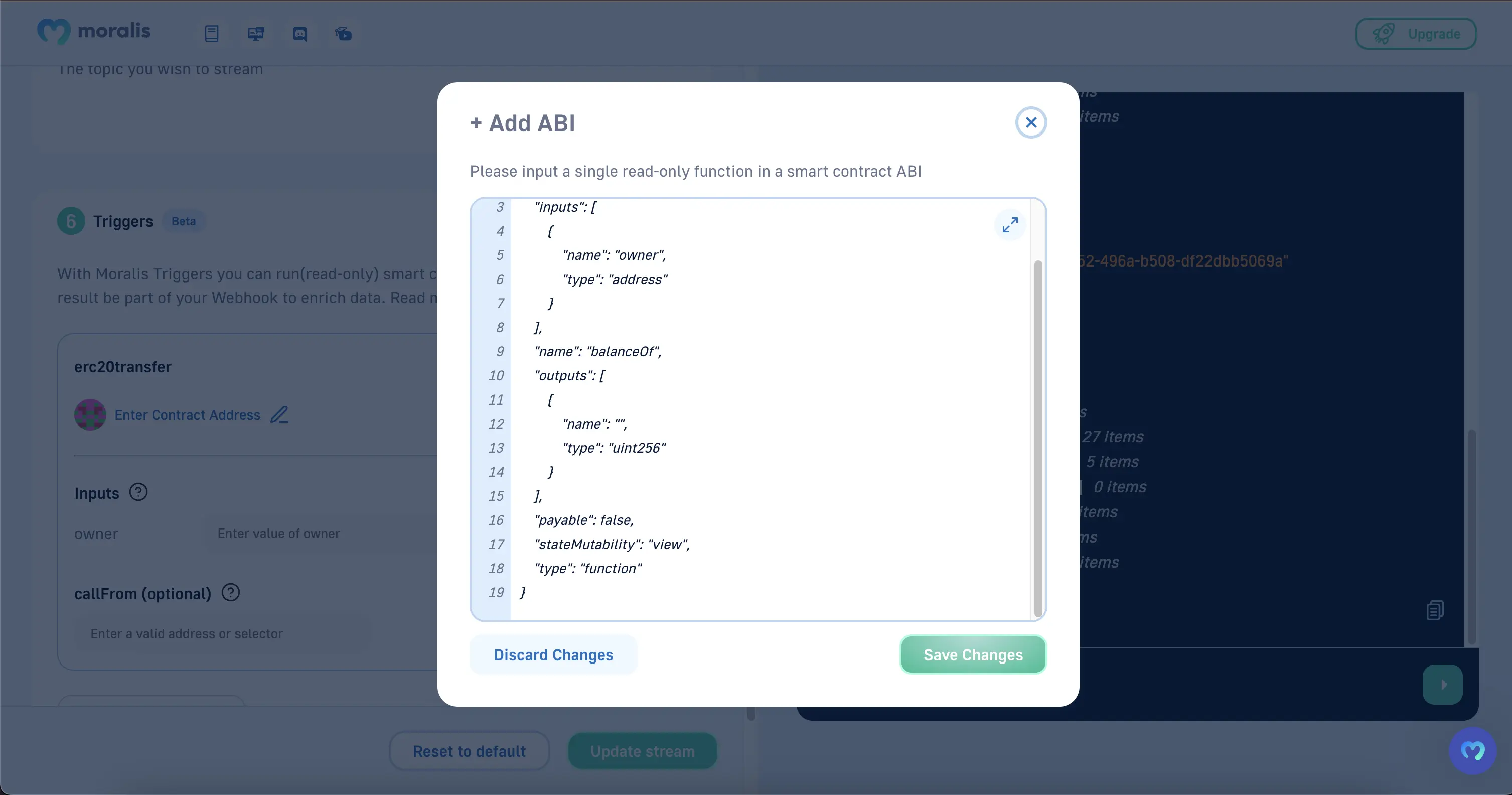 Let us dive into an example right away. Imagine you have a stream that listens to a bunch of addresses and in particular, you are interested in the "erc20Transfers" part of your Webhook. Because you are maintaining a database with all the token balances of the monitored addresses, you normally get the balances after receiving a Webhook with the Moralis API. But what if you can have the balances be part of each token transfer in your Webhook right away? That is now possible with Moralis Triggers!
