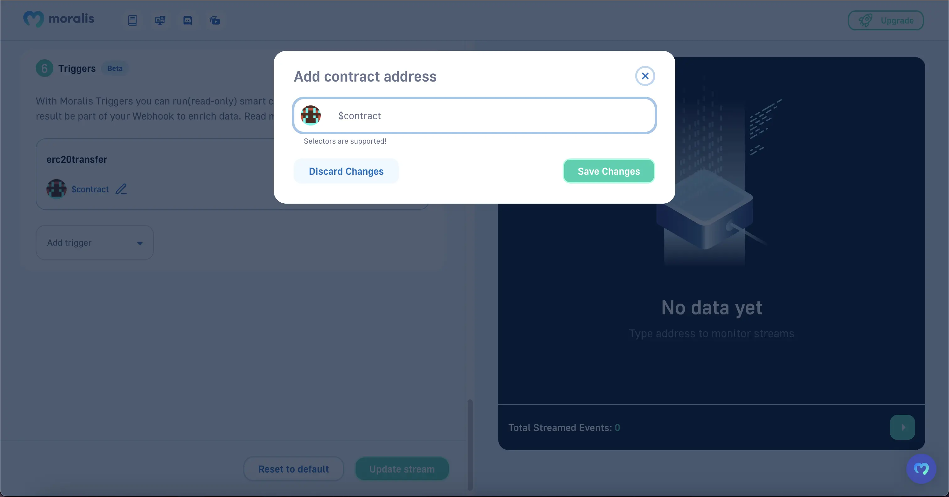 Enter Contract Addressand provide your contract address in the popup. You can also add selectors in this field. Read more about selectors from here. Let's add a selector here$contractand click onSave Changes.