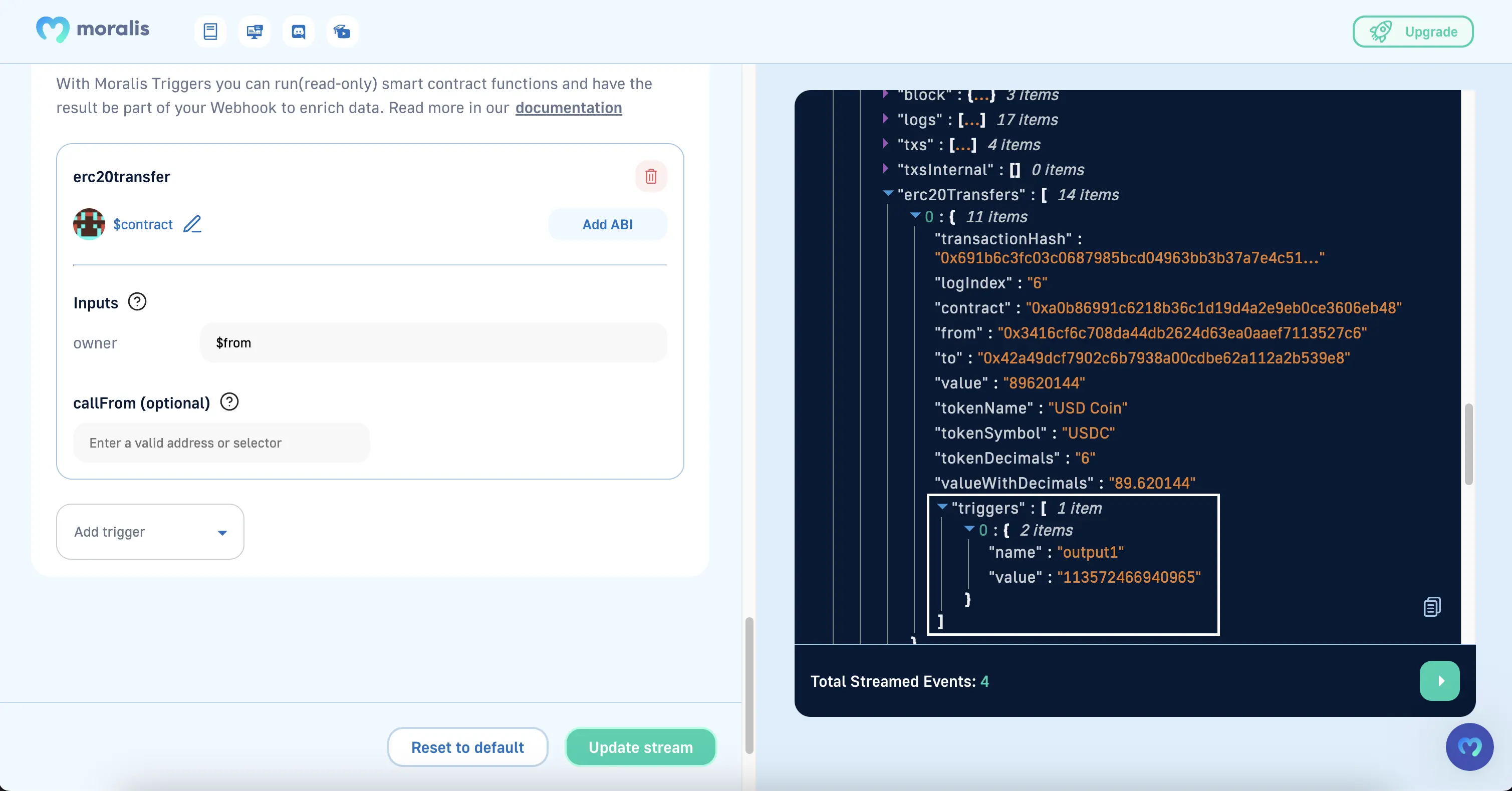 For every transfer in the erc20Transfers of our Webhook, the Streams API runs the balanceOf function and pushes the result in a list of trigger results. Every result contains of a name representing the output name and a value that is the result of the contract call.