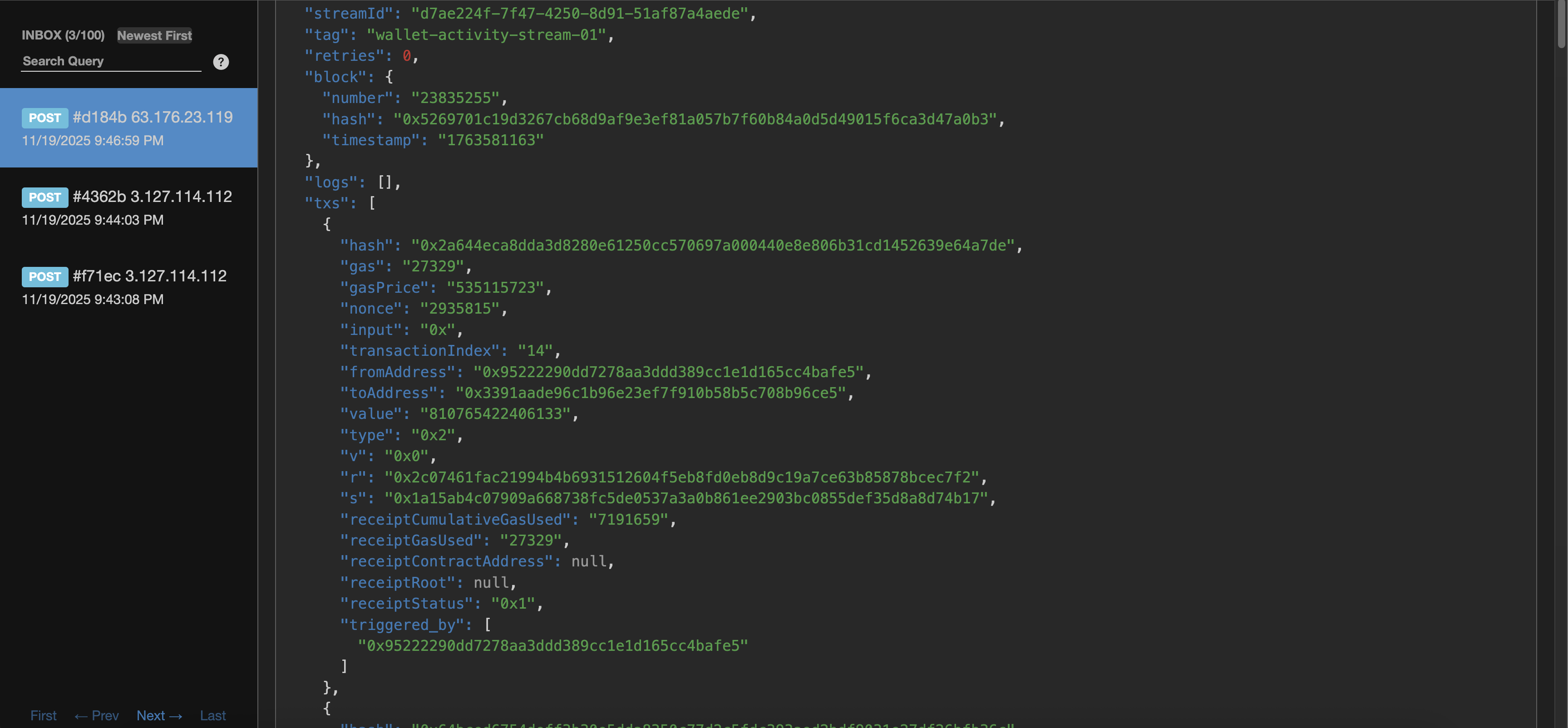 Depending on how you set up your server, once the addresses you have added in the configuration start sending/receiving transaction you should be able to see them on your side. Since we are using https://webhook.site/ , we can see the new event being receive.