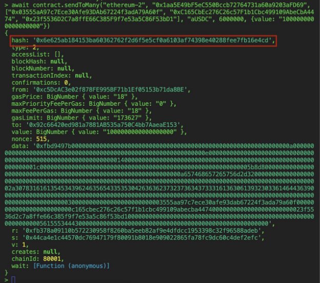 _destChain– The name of the destination chain._destContractAddr– The address the transaction is being sent to on the destination chain._destinationAddrs– The list of addresses that will be receiving the ERC-20 tokens once on the destination chain._symbol– The symbol of the ERC-20 token being transferred._amount– The amount of ERC-20 tokens being transferred.