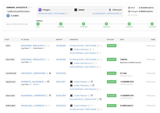 Put the transaction hash returned by the Hardhat console into Axelarscan to see it taking place.