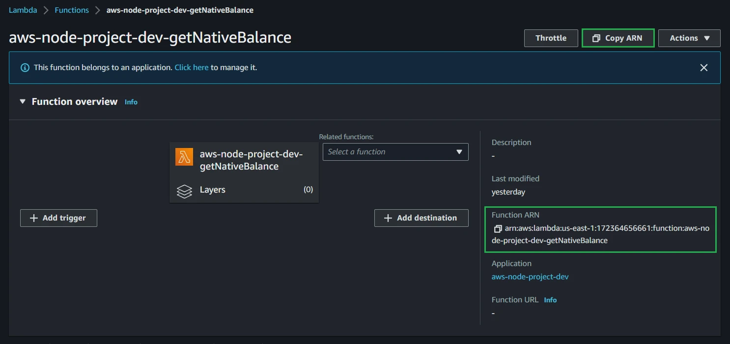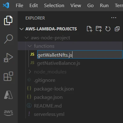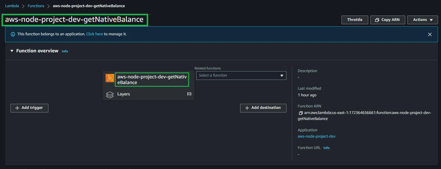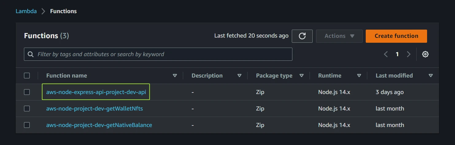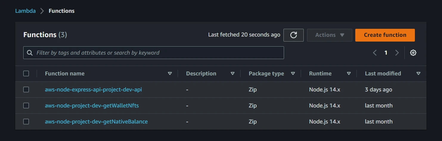 Open the Functions page and choose aws-node-project-dev-getNativeBalance or aws-node-project-dev-getWalletNfts.