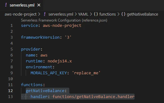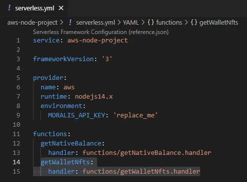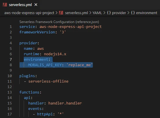 We also want to add the MORALIS_API_KEY as an environment variable. Replace the whole code in serverless.yml with the following: