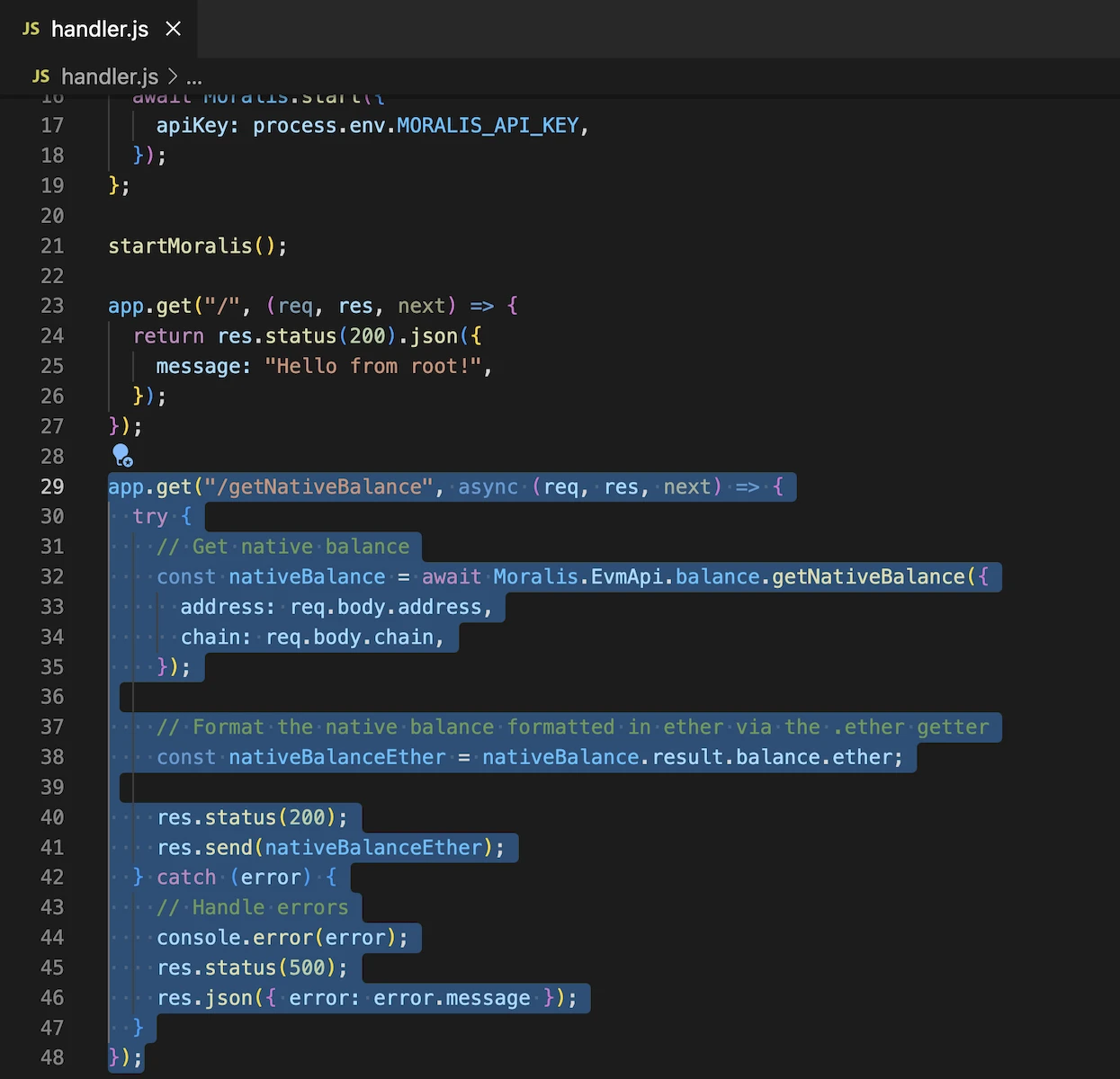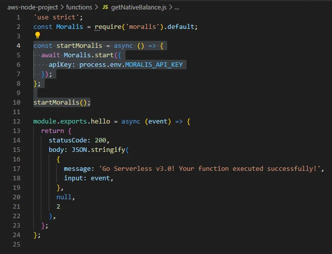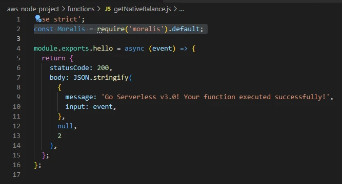 Finally it's time to customize the code in getNativeBalance.js and add the getNativeBalance Moralis functionality. Let's start by adding the Moralis requirement: