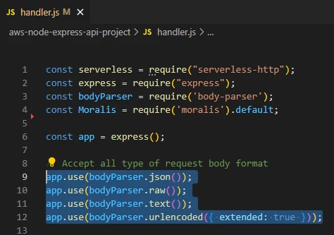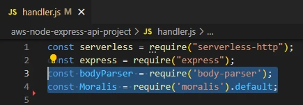 Let's start by adding the packages needed in this app, which are moralis and body-parser. To do so, open handler.js and add the following: