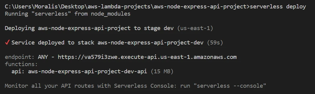 It's time to deploy to AWS. Whatever project you chose, open the terminal and make sure you're in the root folder (where you installed the dependencies). Then, run this simple command: