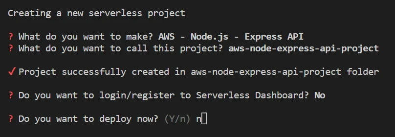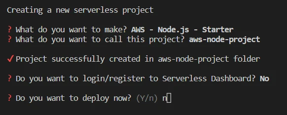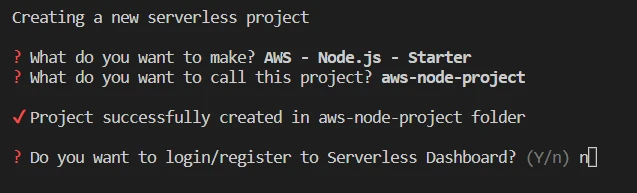 After Serverless has downloaded the template, it will ask you to login/register to the dashboard. We don't need it for this project so type n: