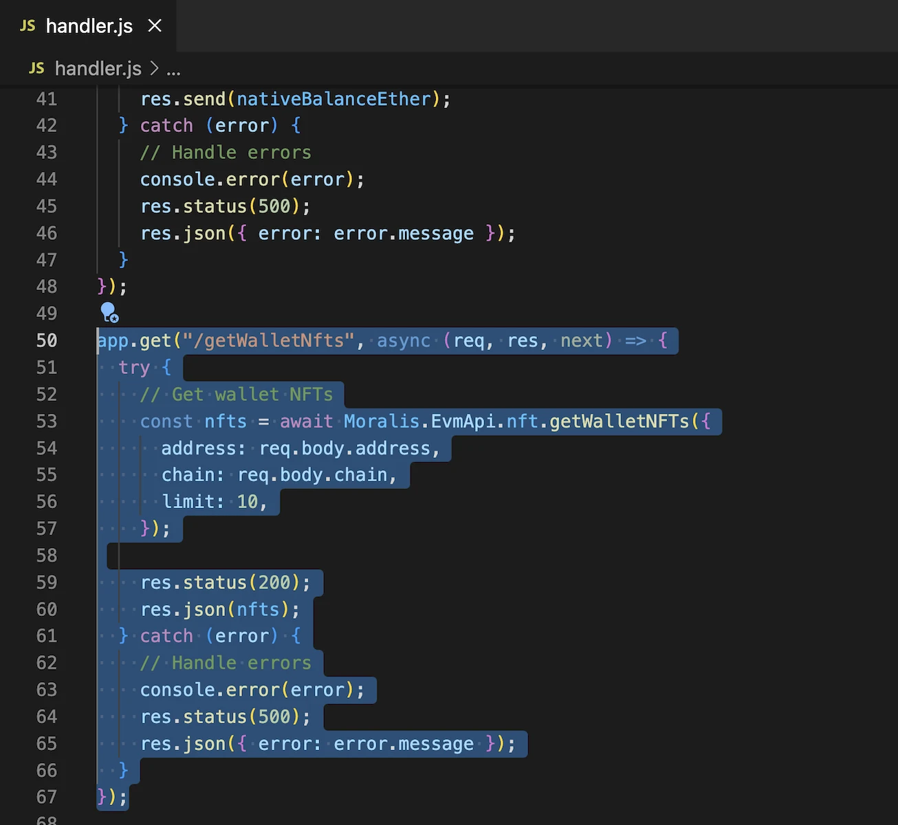 Finally, complete getWalletNfts.js by adding the following code: