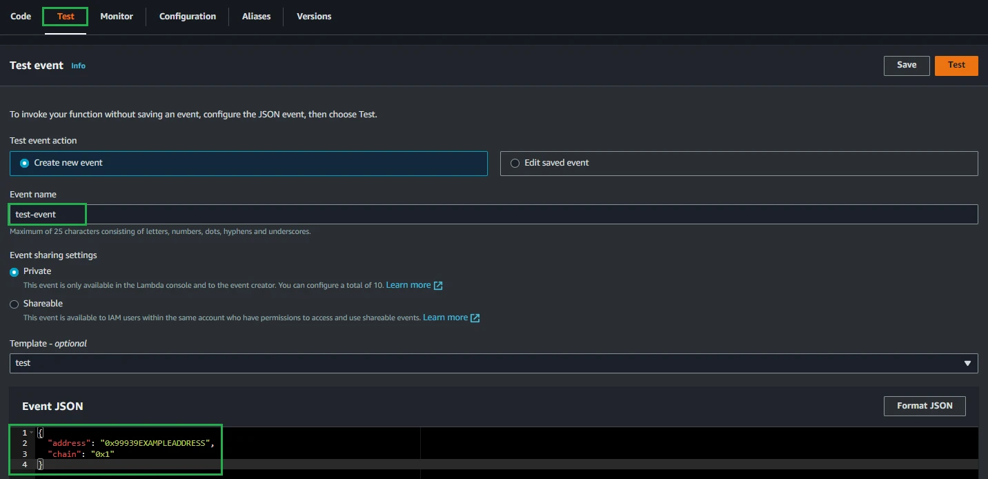 You can test your function by pressing the Test tab. Set an Event name and make sure to add your wallet address and chain as event parameters in the Event JSON section: