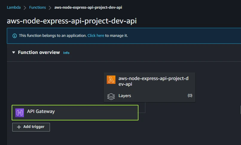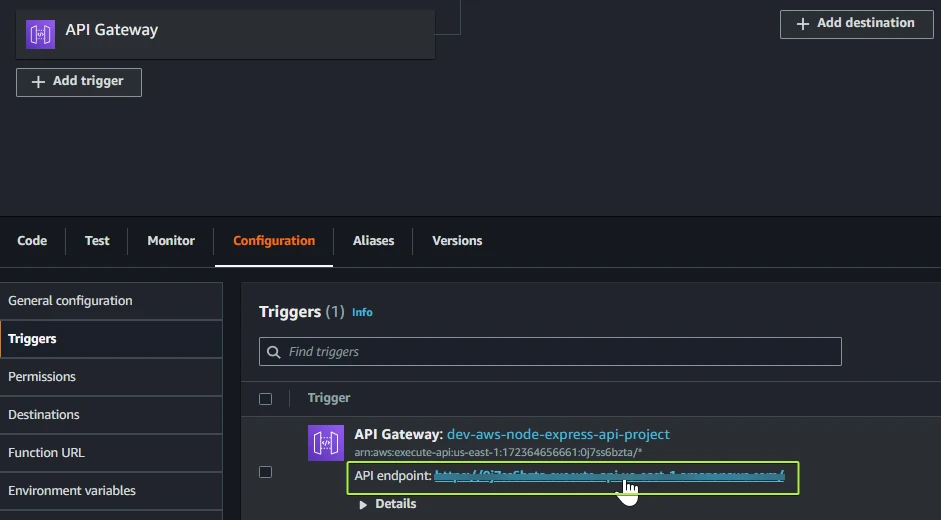 Open the Functions page and choose aws-node-express-api-project-dev-api.