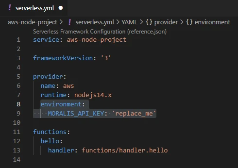 We also want to add the MORALIS_API_KEY as an environment variable. Replace the code in serverless.yml with the following: